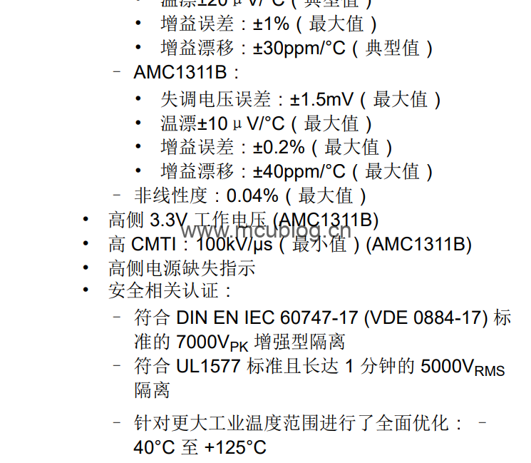 这是TI推出的一款隔离式放大器,放大增益是1。说白了就是个跟随,但重在隔离。输入测最大电压2V,输出是差分信号,所以输出端需要一个差分转单端的电路。其它的看一下截图吧: