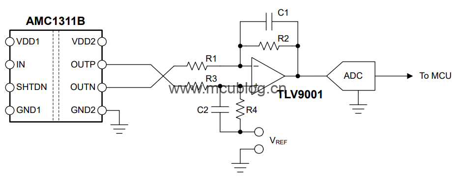 在R1=R2=R3=R4的情况下,输出电压等于(VOUTP – VOUTN) + VREF。