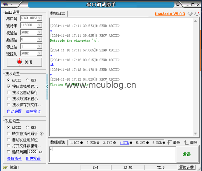 最后发送字符‘v’,软核返回了字符串:Closing the UART file.