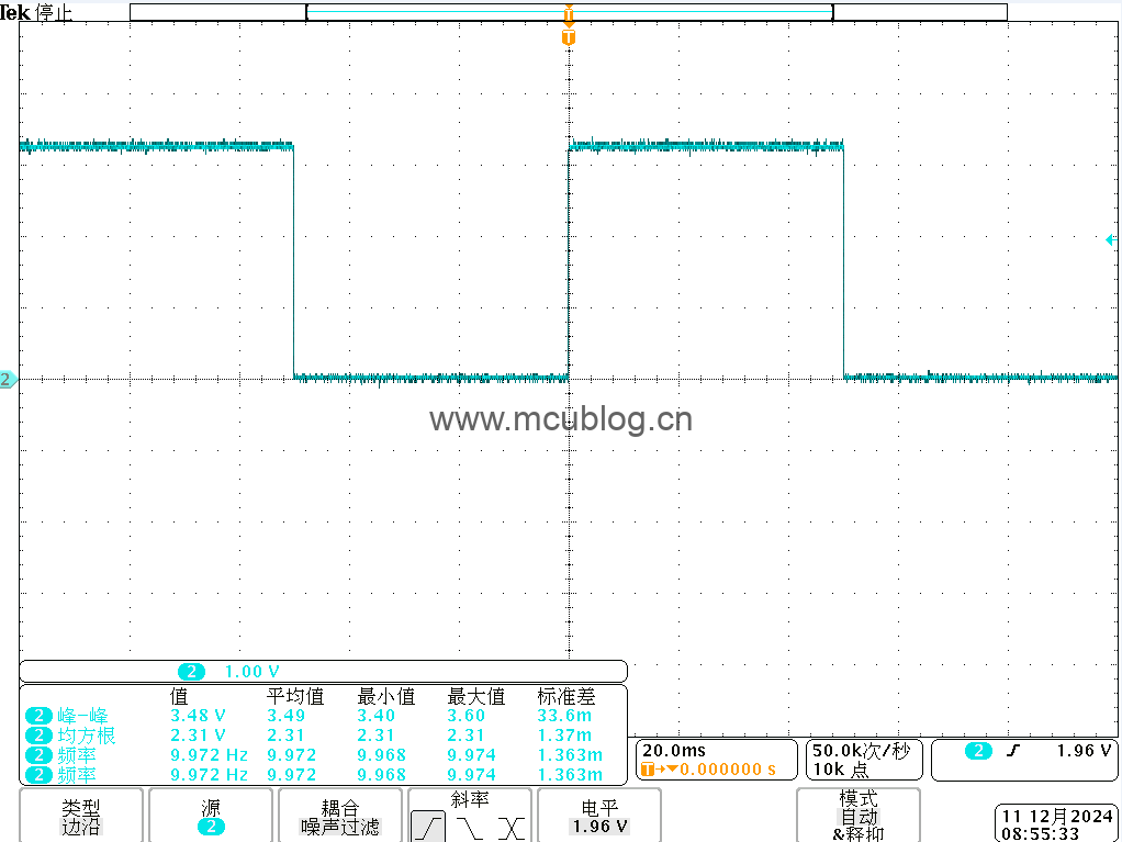 上一篇提过,AD转换完成,并通过DMA存入数组之后,会触发一个中断。在这个中断中,我们取反一个GPIO,通过示波器观测IO翻转的周期,进而确认AD转换的触发时间间隔。