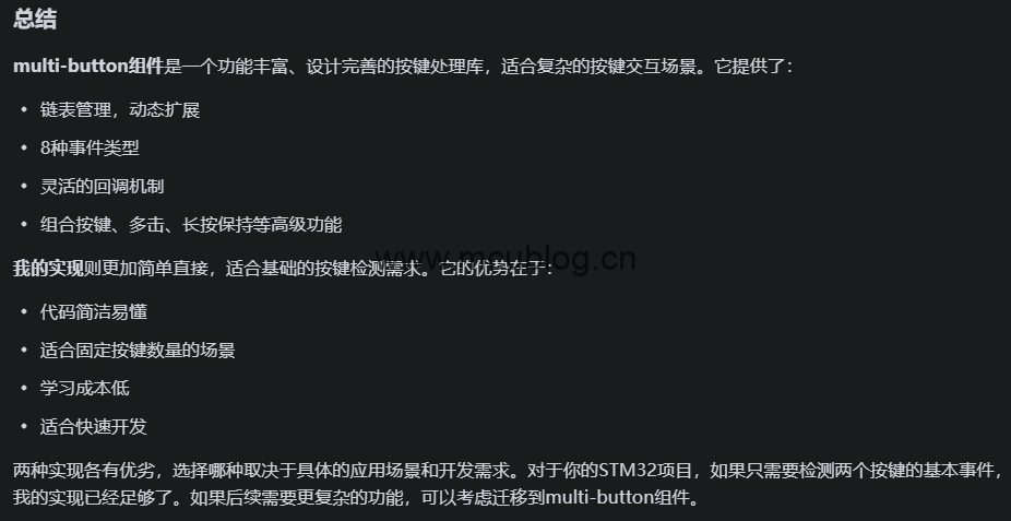 我真是小人之心啊,还以为AI抄的multi-button,没想到真的是自己写的。它还系统分析了两者实现的技术路线和优缺点,内容太多,就不全放进来了。