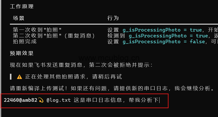 这里分享一个小技巧:调试过程中,如果主要依靠串口打印日志调试的话,每次新程序运行,我会把完整日志存入一个log.txt文档,然后让AI直接看这个文档,获取完整的日志信息。如下图所示: