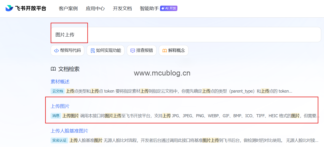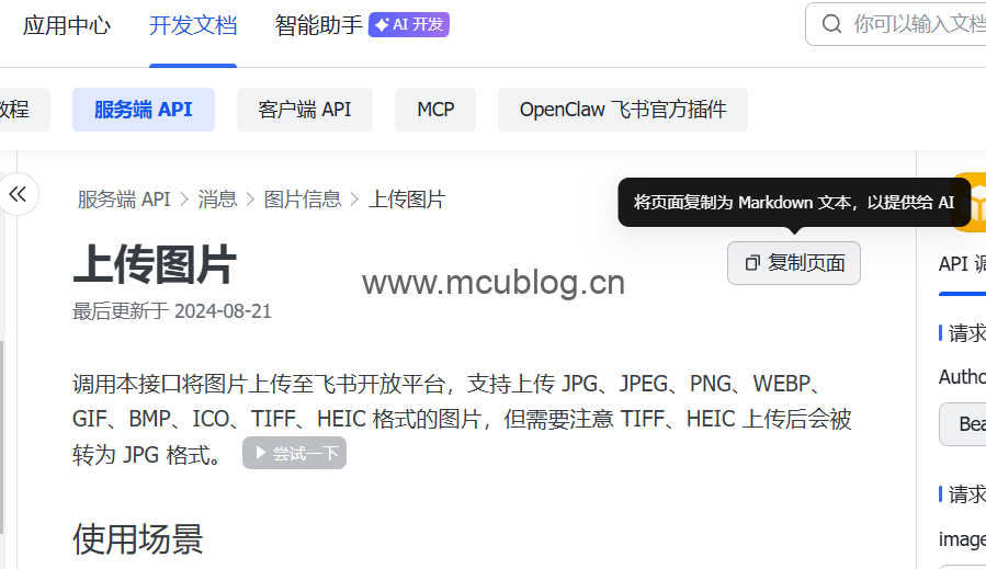 如图,在飞书开放平台搜索:图片上传,就能找到相关的说明页面。而且,这个页面还能够以MD格式复制下来,提供给AI,飞书好像已经算准了我们自己不会看…