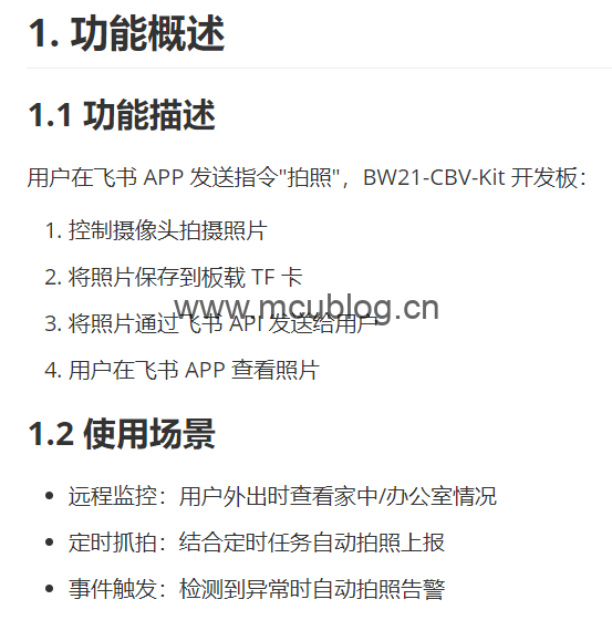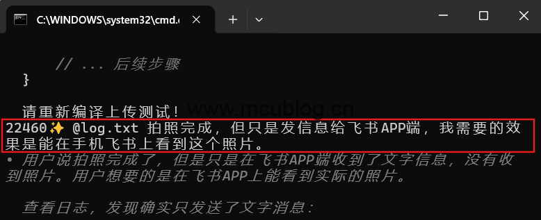 当然不是,我要让飞书手机端发送拍照命令给BW21-CBV-Kit板子,板子拍照,然后上传到飞书服务器,然后显示在飞书手机端。