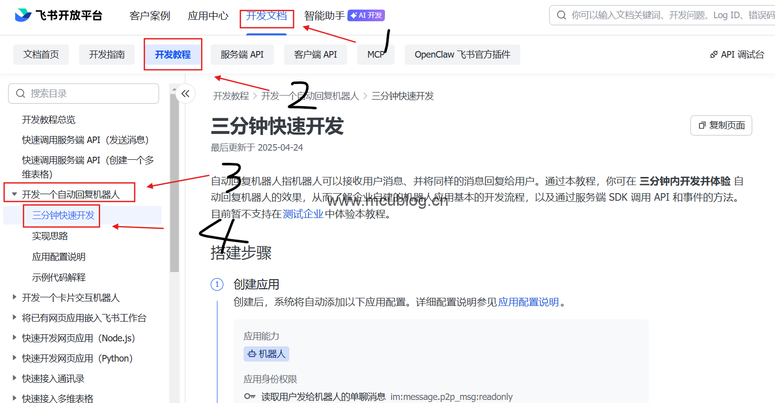 同时,体验一下飞书官方提供的“自动回复机器人”例程,位置如下: